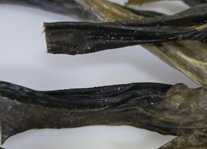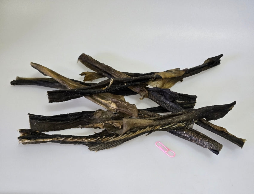 Gedroogde meervalhuid is een natuurlijk kauwmateriaal voor de hond. Door de taaie structuur is de hond er lekker lang mee bezig! De meervalhuid is puur natuur, zonder toevoegingen en beval Omega 3. Omega 3 zorgt bij de hond voor een gezonde huid, glanzende vacht en zorgt voor soepele spieren en gewrichten. Verpakt in hersluitbare zak van 250 gram. De stukken zijn gemiddeld 25 cm per stuk.
