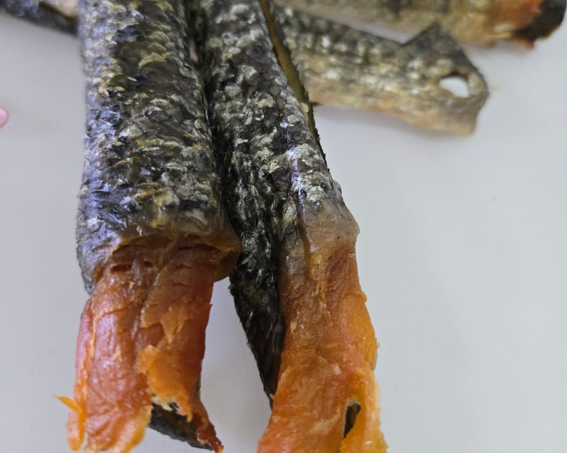 De gedroogde zalmhuid is een smakelijke vissnack voor je hond. De huiden bevatten Omega 3 wat goed is voor vacht en huid. De snacks zijn ook een heerlijke, goede vervanging van kip-, rund- of granensnacks. De vette zalmhuid bevat nog wat vleesresten aan de huiden wat het extra lekker maakt voor de honden!